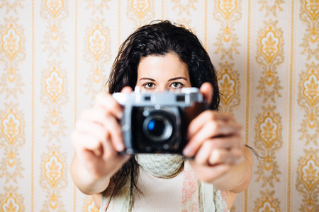 流行に敏感な女性の観賞用の壁紙にビンテージ レトロなフィルム カメラで写真を撮って の写真素材 画像素材 Image